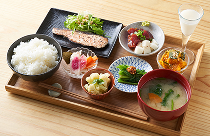 鮭の酒粕味噌焼き、または鯖の甘酒味噌煮/まぐろの醤油麹漬け卵黄和え/麹料理の小鉢4品/生味噌とお野菜のお味噌汁/富山県産コシヒカリ/ミニ甘酒付き