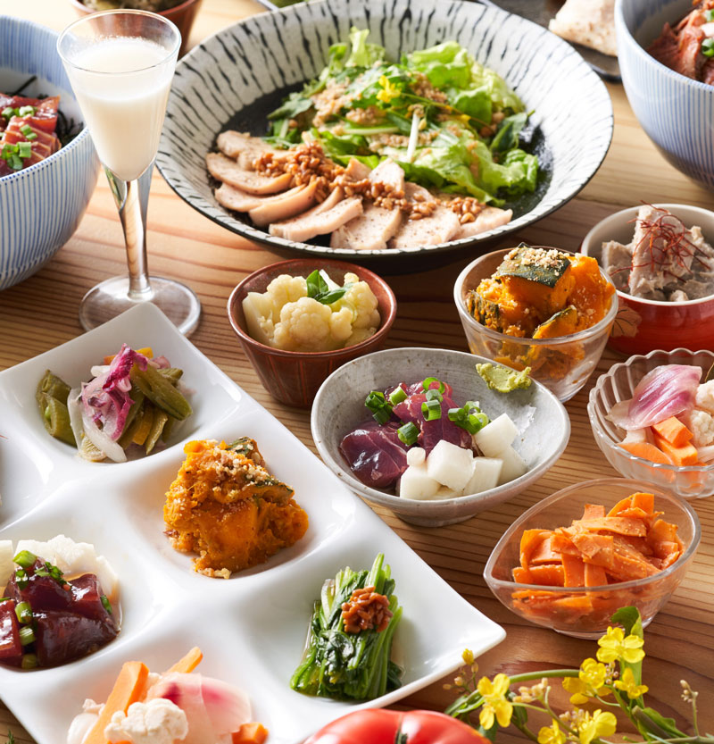 麹のお料理6種のプレート/麹漬け蒸し鶏のサラダ/クリームチーズの酒粕味噌漬け/麹のメイン料理1/麹のメイン料理2/特製まぜごはんとお味噌汁/ミニ甘酒/甘酒のデザート