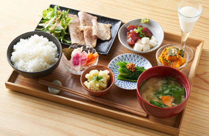 豚ロースのやわらか酒粕麹焼き/まぐろの醤油麹漬け卵黄和え/麹料理の小鉢4品/生味噌とお野菜のお味噌汁/富山県産コシヒカリ/ミニ甘酒付き